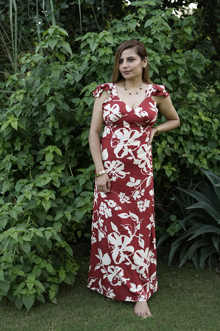 Floral Ruffle Sleeve Maxi Dress – Rust Red